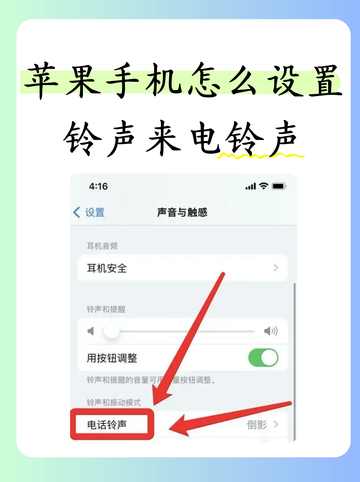 1打开itunes并且连接上手机2下载你想要设置铃声的音乐3打开iTunes,把你下载好的音乐导入4点击该歌曲右键显示简介设置好时间后点击确定5然后再点击该歌曲,在下面的信息中,再点击该歌曲名字,然后点击左上角文件转换创建AAC版本6这个文件夹里的铃声应该已经转;1首先手机自带的软件“设置”,点击进,如下图中所表示2选择“声音与触感”这个设置选项,如下图中所表示3点击“电话铃声”,如下图中所表示4进入“电话铃声”过后,就可以根据自己的要求,设置手机铃声了,如下图中所表示。