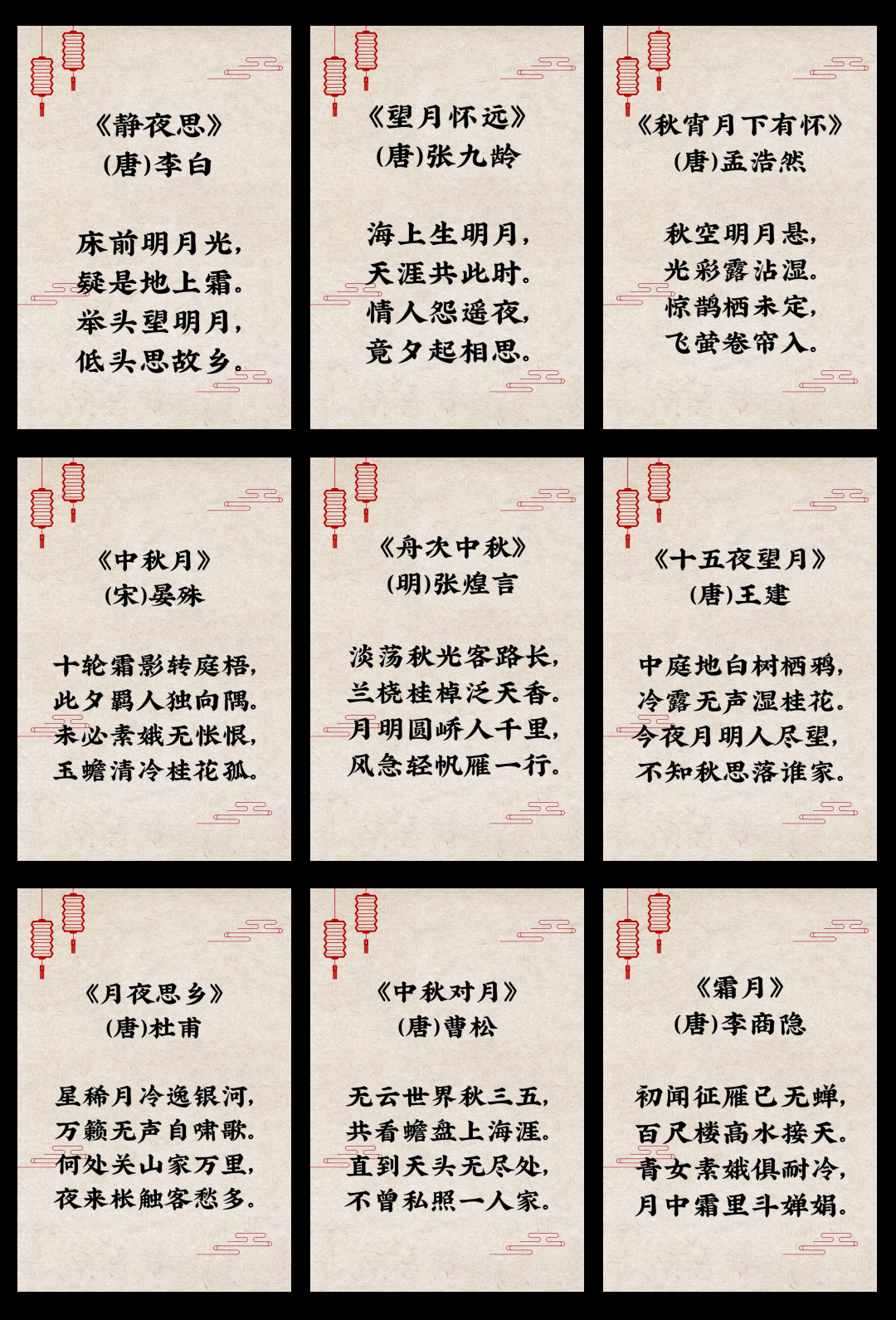 1静夜思唐李白床前明月光,疑是地上霜举头望明月,低头思故乡2月夜思乡唐杜甫星稀月冷逸银河,万籁无声自啸歌何处关山家万里,夜来枨触客愁多3中秋对月唐曹松无云世界秋三五,共看蟾盘上海涯直到天头天尽处,不曾私照一人家4天竺寺八月十五日夜桂子。