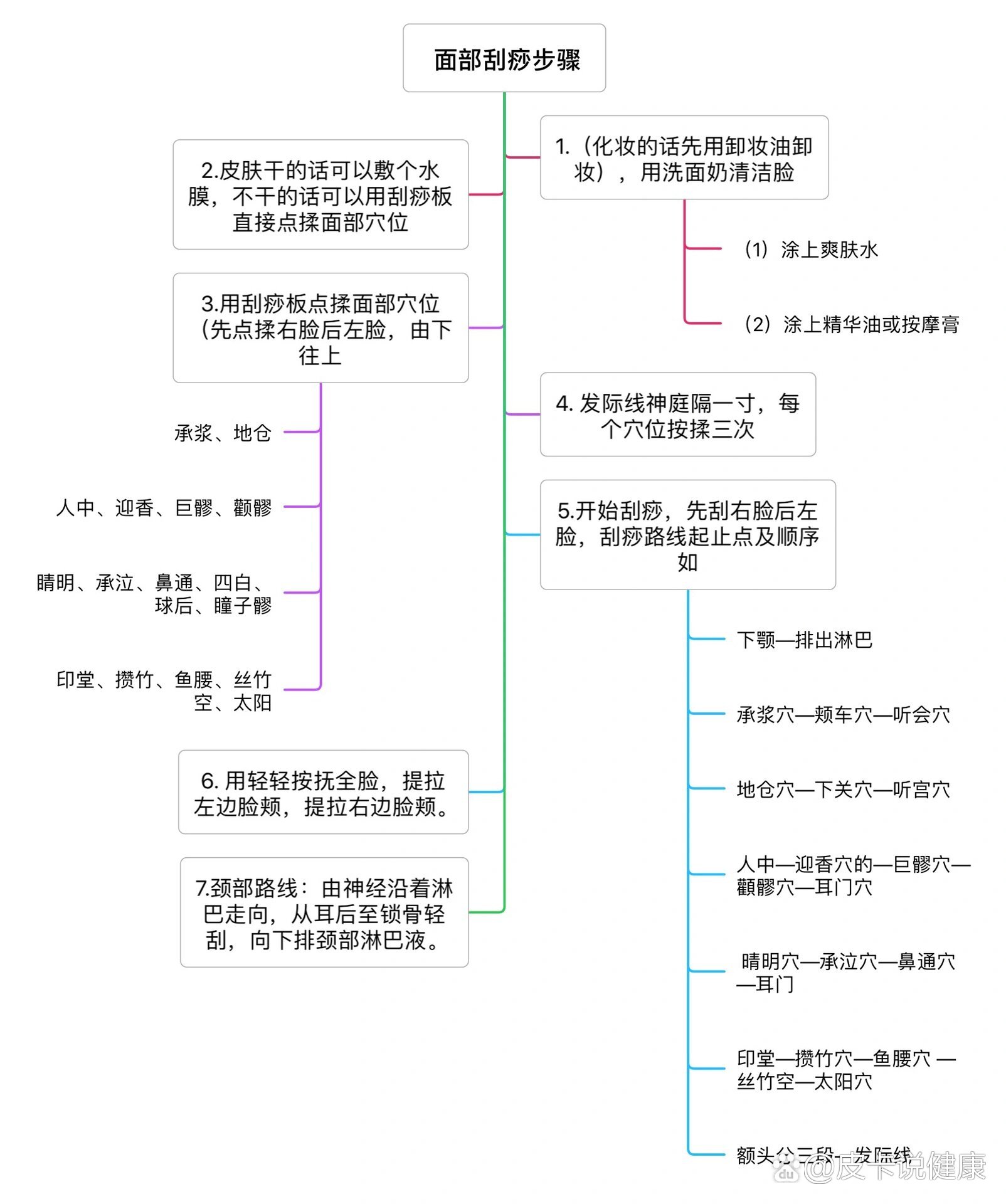 做面部刮痧的步骤1必须先用洗面奶进行深沉清洁,不可以在没有洁面的情况下刮痧2将具有润滑作用的刮痧油涂抹在面部3用小小的牛角刮痧板以鼻梁为中线,沿经络走向,以轻柔的手法分别向左右两侧刮拭4清洁面部,将面部的刮痧油清洁干净5搽上保湿的爽肤水以及面霜,进行适当的按摩,力度;在进行保健刮痧和头部刮痧的时候可以不适用任何介质,可以直接隔着衣服进行刮痧,但是手法一定要轻刮痧的时候千万不能过度饥饿,而且不建议空腹进行刮痧,最好在用过餐之后的1至2小时后进行刮痧避开空调风扇较冷的空间操作刮痧后及时喝温开水,糖盐水补充水液能量面部刮痧要用精油吗 脸部刮。