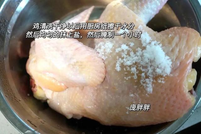1. 把鸡清洗干净,用厨房纸擦干鸡表面的水分。均匀抹上盐,里里外外都要抹上哦!然后腌制一个小时!