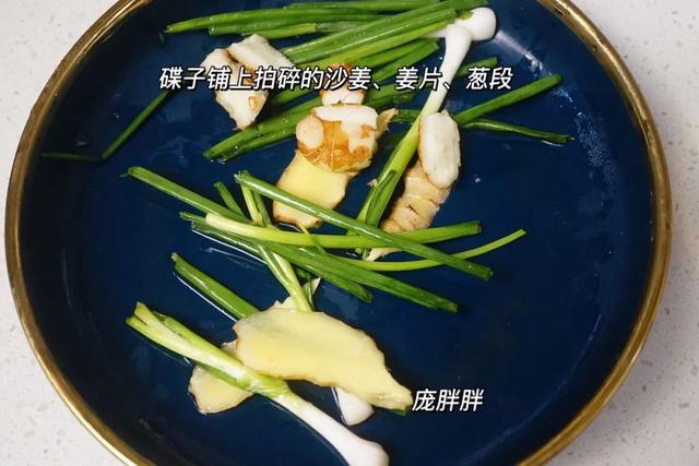 2. 蒸鸡的深盘铺上姜片、葱段、拍碎的沙姜。