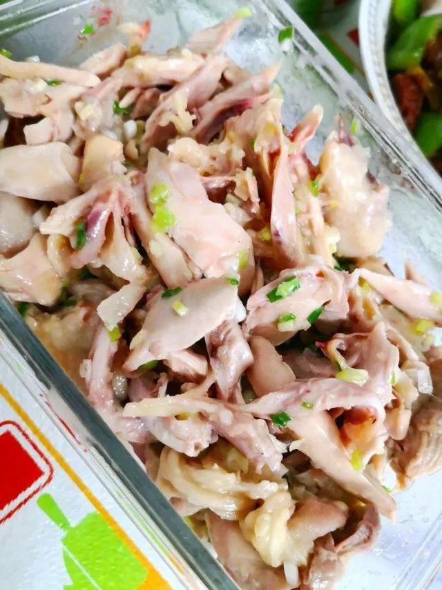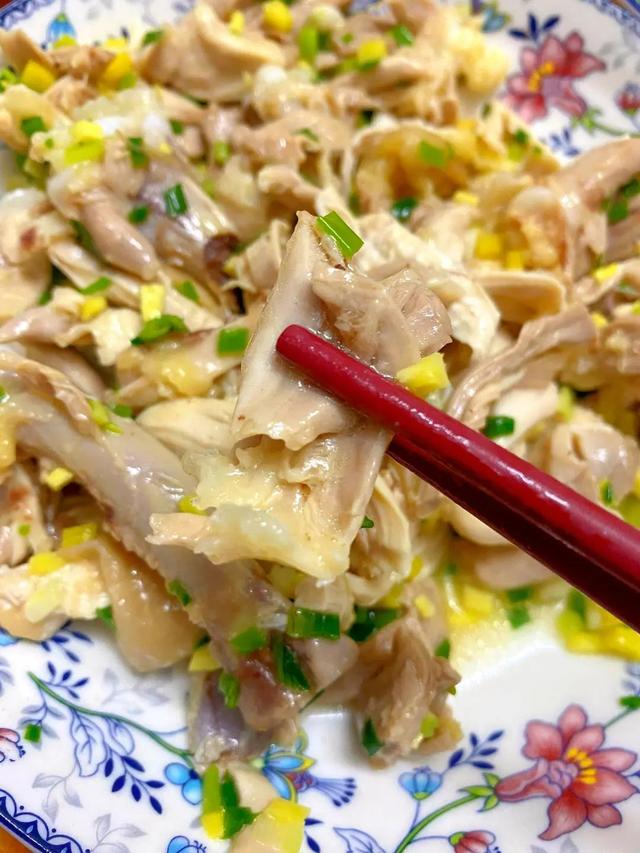 戴个手套把肉撕出来放盘子里。把葱姜料汁淋在鸡肉丝上,油可以不用全下,再用手抓均匀入味。