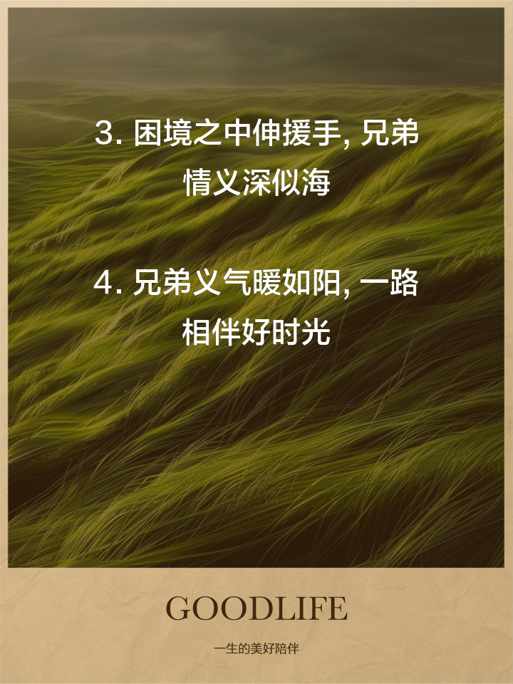 1兄弟一心,不离不散2兄弟如手足,妻子如衣服谁动我手足,我穿他衣服谁穿我衣服,我剁他手足3从今天到世界末日,我们永远会被记得,我们幸运的少数,我们相依相系的兄弟,谁今日与我共同浴血,他就是我的兄弟4我们的情谊高如山,深似海,烈如酒,长如江5兄弟就像冬天的;1兄弟情义,患难与共,无论在任何情况下,我们都能彼此扶持,相互守护2兄弟情义,无需解释,只需彼此心灵相通,默契在心间,情意绵绵3兄弟情义,情深似海,无论风雨还是晴天,我们携手同行,永远不分离4兄弟情义,比金坚,岁月或许会改变容颜,但永远改变不了我们之间的这份深情厚谊5;以下是关于兄弟情义的励志句子兄弟一心,不离不散这份坚定的信念是兄弟情谊最核心的体现,无论遭遇何种困难,兄弟间的心始终紧密相连兄弟如手足,情深似海这句俗语形象地表达了兄弟之间深厚的情感纽带,如同自己的手脚一般不可或缺,彼此间的情谊深不可测从今天到世界末日,我们永远会被记得;22我有一帮兄弟,再久不联系,聚在一起也不会陌生,这是我的荣幸23兄长有情义薄天,弟兄友谊永不变义正胸阔爱长存,气虹豪迈男儿魂24有情千里不远,有缘一线可牵相知是情,相识是缘朋友,一路走好25几年的同窗,我与你结下了深厚的友谊,愿你我心灵间的交流,直到永远。