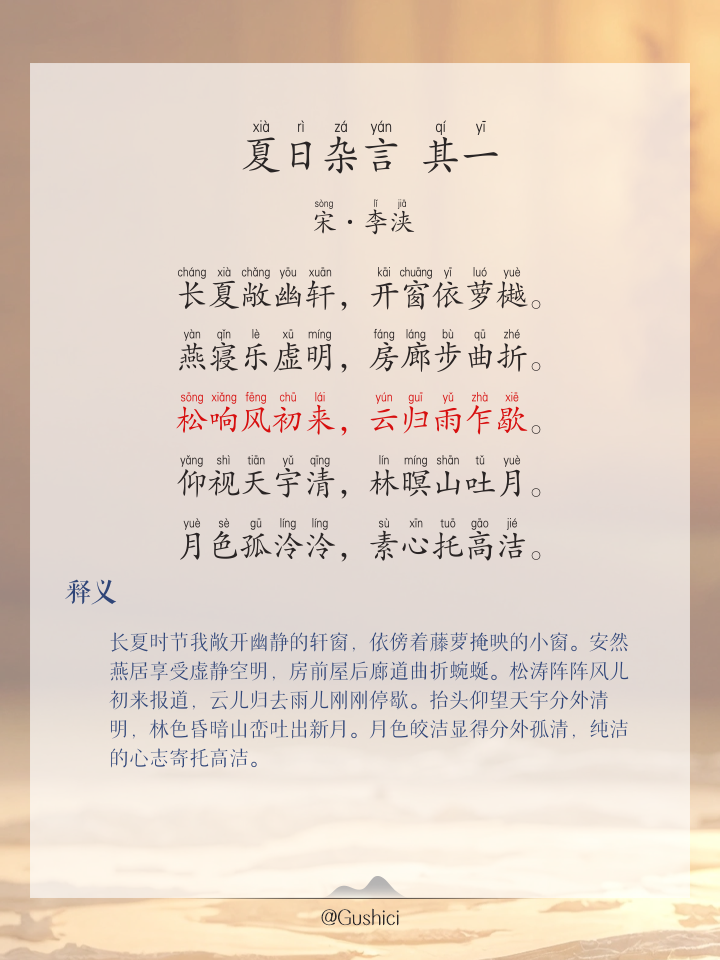 写夏季傍晚日落月上乘凉之景唐·孟浩然夏日南亭怀辛大小池残暑退,高树早凉归 唐·沈佺期夏晚寓直省中仲夏苦夜短,开轩纳微凉 轩窗唐·杜甫夏夜叹绿阴生昼静,孤花表春余 孤花一枝花春余春天剩余之景,时已至初夏唐·韦应物游开元精舍残云收夏暑,新雨带秋岚 岚雾气唐·岑参水亭送华阴王。