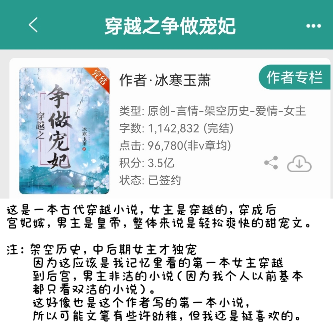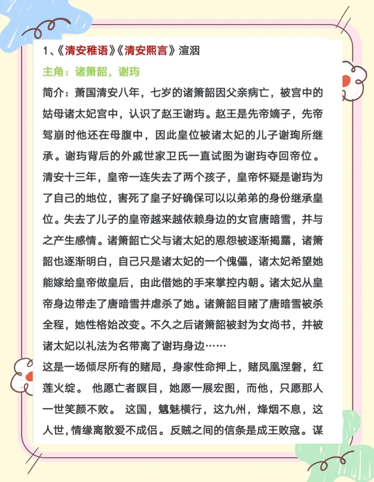 8、4誓不为妃 总结穿越架空,阴谋文,男女主都是强势腹黑的人5醉玲珑 总结文笔不错,一部出名的穿越小说,女主聪明,男主是温柔型的6月沉吟 总结万能女主,女扮男装入朝为官,武功高强男主性格比较沉稳7若爱只是擦肩而过 总结女主拥有清丽脱俗的外貌和傲人的武功,性喜静,聪明。