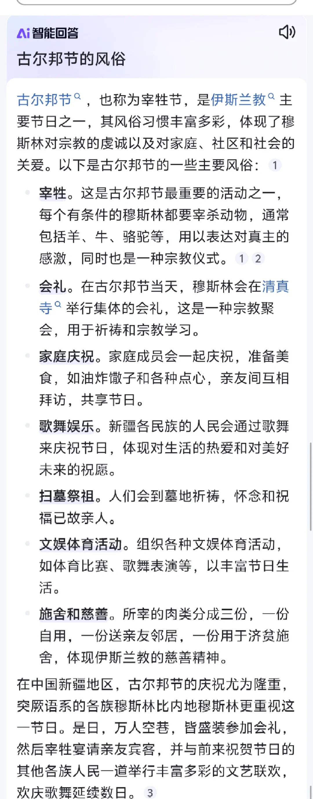 这一天,人们会进行宰牲祭祀会礼等活动,共同庆祝这个重要的节日这些活动不仅丰富了各族群众的文化生活,也弘扬了民族团结的精神同时,古尔邦节也是增进民族团结的契机和桥梁纽带,通过一系列庆祝活动加强了不同民族间的交流和融合总的来说,古尔邦节是一个富有宗教色彩和文化内涵的民族节日。