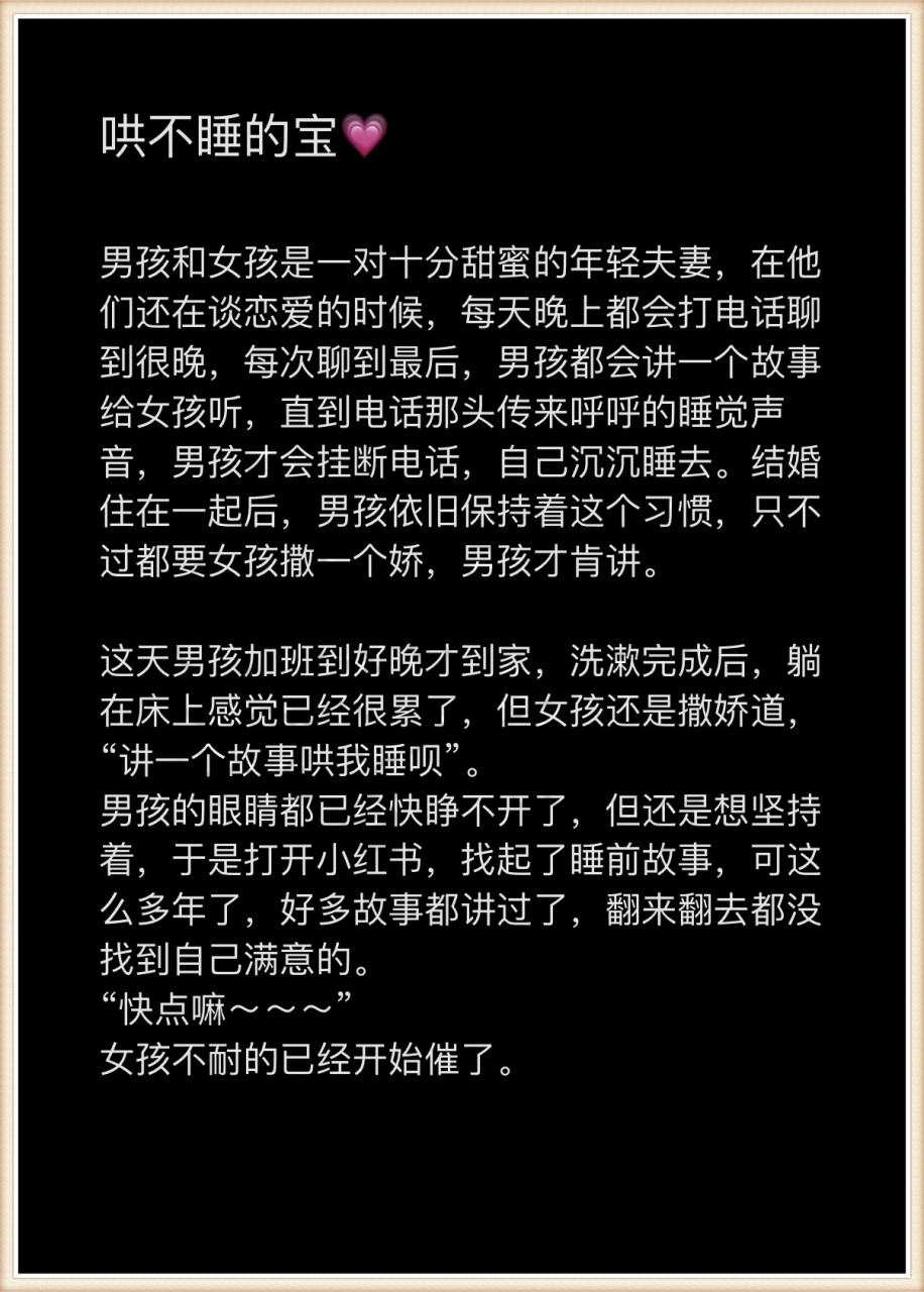9、晚上给女朋友讲故事哄睡觉的故事,现在已经很多男生会给男朋友讲睡前故事了,该怎么讲睡前故事撩她到心跳加速陪你到通宵呢,睡前故事可以说是很非常浪漫的一件事,晚上给女朋友讲故事哄睡觉的故事 晚上给女朋友讲故事哄睡觉的故事1 1从前有两只小猪,整天过着无忧无虑的生活,他们互相相爱着,每天主人送来吃的时候。