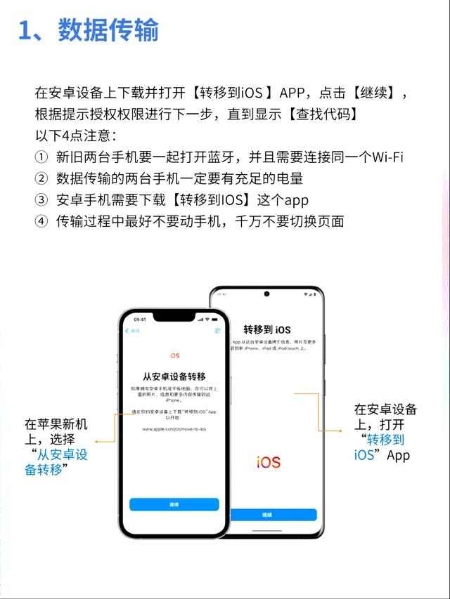 在安卓设备上下载并打开【转移到 iOS】APP,点击【继续】,按照提示授权权限一步步操作,直至出现【查找代码】。这里有 4 个关键注意点,一定要牢记: