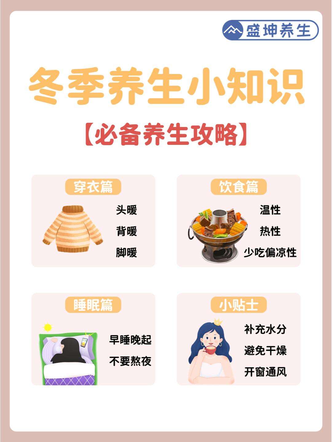 15、冬季养生需从起居饮食运动等多方面综合调整,以下为具体养生常识一起居养生早睡晚起冬季应养成早睡晚起的习惯,保证充足深度睡眠从养生学角度,适当延长深度睡眠时间有助于人体阳气潜藏和阴精积存,达到“阴平阳秘,精力乃治”的健康状态深度睡眠时需注重防寒保暖,避免冷风侵袭引发感冒呼吸。