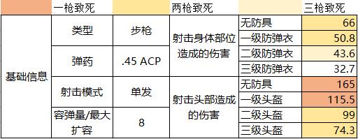 4、一手枪类 P18C基础伤害38,射速较快,适合近距离快速射击 R1895基础伤害55,单发伤害较高,但射速较慢 P92基础伤害35,稳定性较好,适合新手使用 P1911基础伤害41,射速和伤害均适中 沙漠之鹰基础伤害62,单发伤害极高,但后坐力大,射速慢二冲锋枪类 UMP45基础伤害35,射。