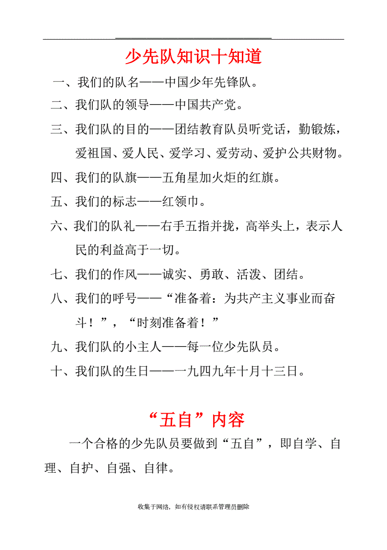 12、少先队基本知识主要包括以下几个方面少先队的概念与性质少先队是中国少年儿童的群众组织,是建设社会主义和共产主义的预备队其宗旨是团结教育少年儿童,培养良好品德,为建设社会主义事业和共产主义事业培养合格的建设者和接班人少先队的组织构成少先队由总队大队中队和小队组成小队是最基层的。