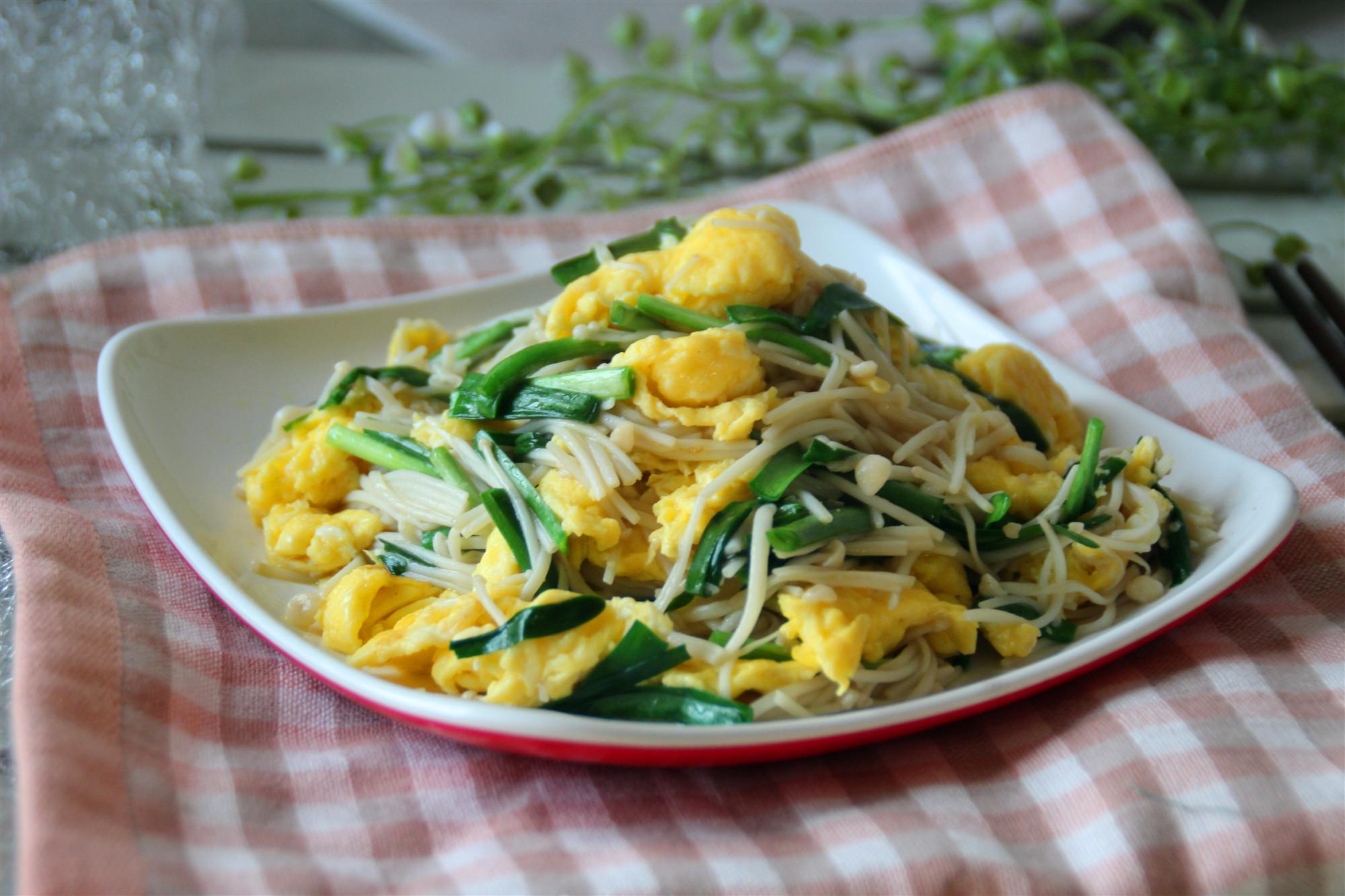 1、金针菇炒鸡蛋 材料鸡蛋3个,金针菇1把,青椒1个,料酒少许,盐适量,油适量 做法 1金针菇去掉根部洗净焯水捞出切成小段 2鸡蛋盐料酒搅打散,炒熟盛出 3青椒去籽洗净切成丝,放入油锅中炒至断生,放入金针菇炒匀#x2795盐调味,放入鸡蛋一起炒匀即可,出锅撒葱花 已赞过 已踩过lt 你对这个回答的评价是? 评论。