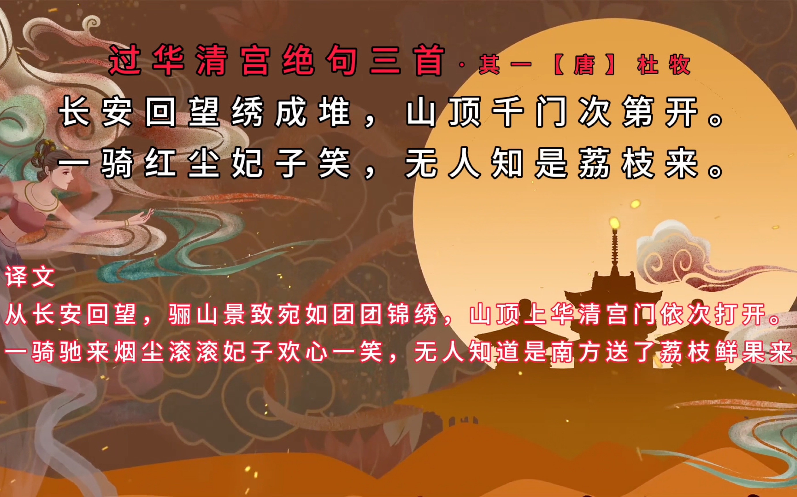 5、译文在长安回头远望骊山宛如一堆堆锦绣,山顶上华清宫千重门依次打开一骑驰来烟尘滚滚妃子欢心一笑,无人知道是南方送了荔枝鲜果来。
