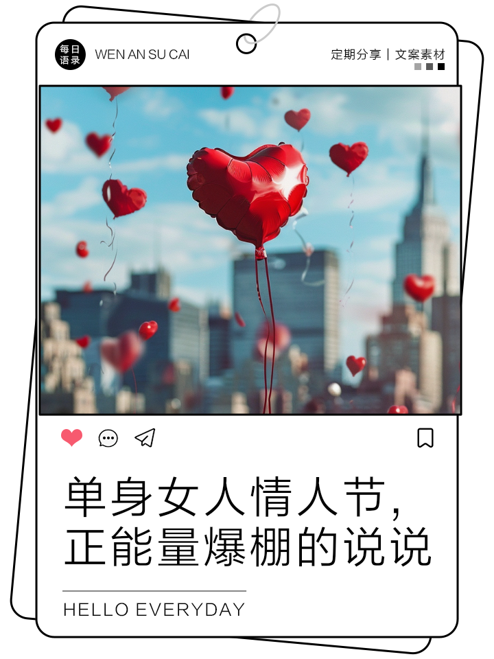 1只不过是一个纪念自己单身的日子单身狗们也有自己的纪念日情人节2那就是我自己我的心里只有一个人因为我是单身狗3就像是会场上的蛋糕,情人节对于单身狗来说看起来很美味,但却不能吃4即使是情人节单身狗的快乐不是别人能夺走的5而单身狗的故事就是一个人在情人节;单身狗520搞笑语录 1曾经班上也有一个女孩子天天在本子上写,还是写我的名字,我以为她喜欢我,后来才知道,她是纪律委员 2情人节给你们推荐一部必看的电影,男女恩爱有加,故事情节温馨浪漫,这部电影叫做消失的爱人,最后祝大家节日快乐 3就让我回到遇见你之前的生活,提不上好过也不算快活,但说起来又;适合单身狗七夕发的文案集合四十八条 适合单身狗七夕发的文案篇一 1我想成为一个温柔的人,因为曾被温柔的人那样对待,深深了解那种被温柔相待的感觉夏目友人帐 2改变固有的思想,人生就可能迎来转机 3今天是情人节,可和我又有何关系,从来都是没有情人的情人节 4突然好想我对象,也不知道他;情人节一个人过的幽默说说短语如下1光棍是一种境界,不一个人过怎能对得起这个日子2单身挺好,可以跟别人暧昧,可我连个暧昧对象都没有3情人节不想做单身狗看别人秀恩爱的,你就主动跟老子表白啊4单身挺好,不吃醋,不流泪,不在乎,不怕离开,不怕失去,不怕被欺骗背叛,不怕自。