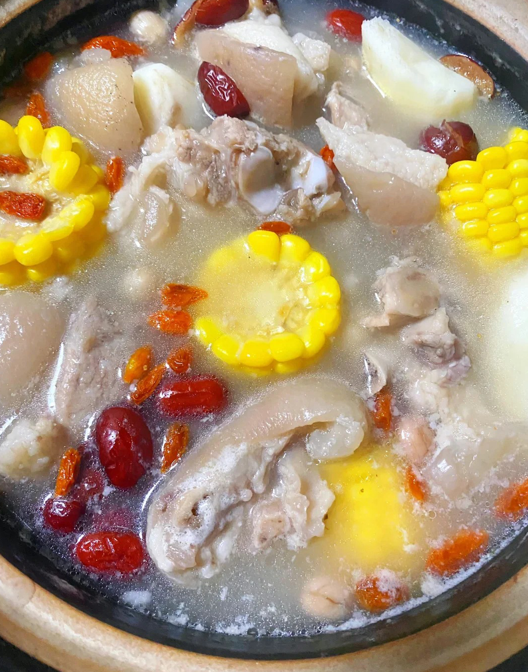 9、食材猪脚 + 胡萝卜 + 玉米 + 香菇 功效富含维生素和膳食纤维,汤水清甜,适合全家饮用通用小贴士1 去油腻炖汤前焯水去血沫,或加几片山楂陈皮帮助解腻2 增鲜味加少许干贝或瑶柱提鲜,减少盐的用量3 禁忌高血脂或痛风患者少喝浓汤,高血压者少放盐根据体质和季节调整搭配。