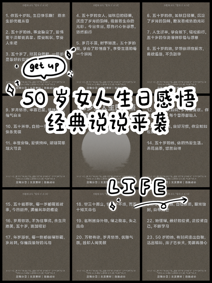 健康平安类可强调“无病无忧”的核心诉求“岁岁平安胜千金,身如松柏心常春”“五十刚好正当年,无病无愁赛神仙”生活感悟类适合带时间维度“五十知味更知趣,清风明月正好时”“半世烟火半世诗,从此日日是好日”针对职场人士,事业祝福需规避“升职加薪”等功利表述,改用“五十再启新征途,胸。