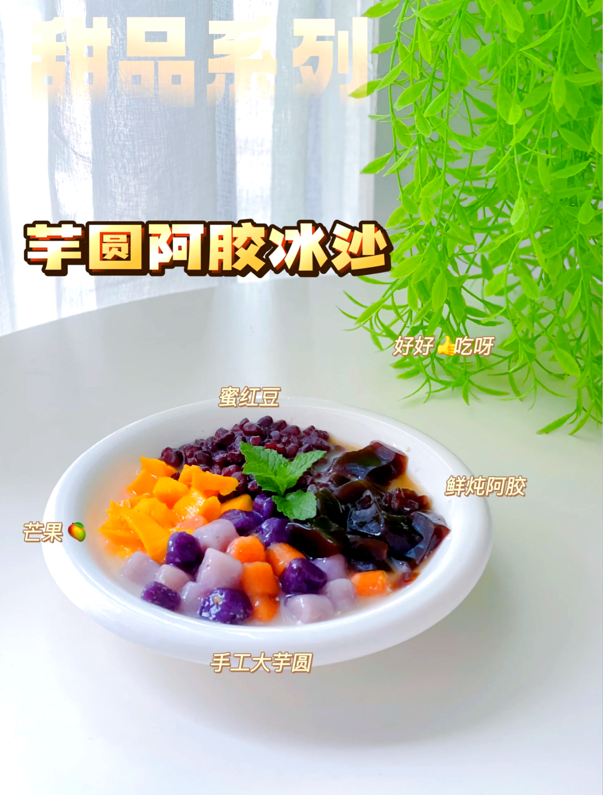 3煮芋圆 芋圆可以自己做,也可以出去买 水开倒芋圆下去煮,煮到芋圆浮起来再煮三分钟,然后过冷水,沥干水分后放入碗中加入凉白开防止粘黏 4煮香芋 芋头切块,放入锅中加入清水至持平芋头 煮开后转中火煮八分钟,再加入一层白糖继续煮八分钟,这时候芋头已经出沙了,吸满了糖分 煮好后倒入碗中放凉备用煮的时间。