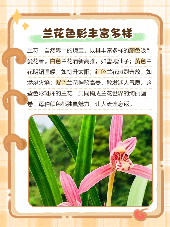 1 春兰春兰又称山兰草兰,是开花的春季种类它的根细长,茎的假鳞茎较明显,叶狭带形,花期在2月至3月之间春兰的花朵直径在48厘米之间,花色丰富,具有香气经过长期的人工选育,春兰已有许多珍稀品种,如宋梅西神梅万字等2 夏兰夏兰,或称蕙兰,是夏季开花的种类它的根较粗。
