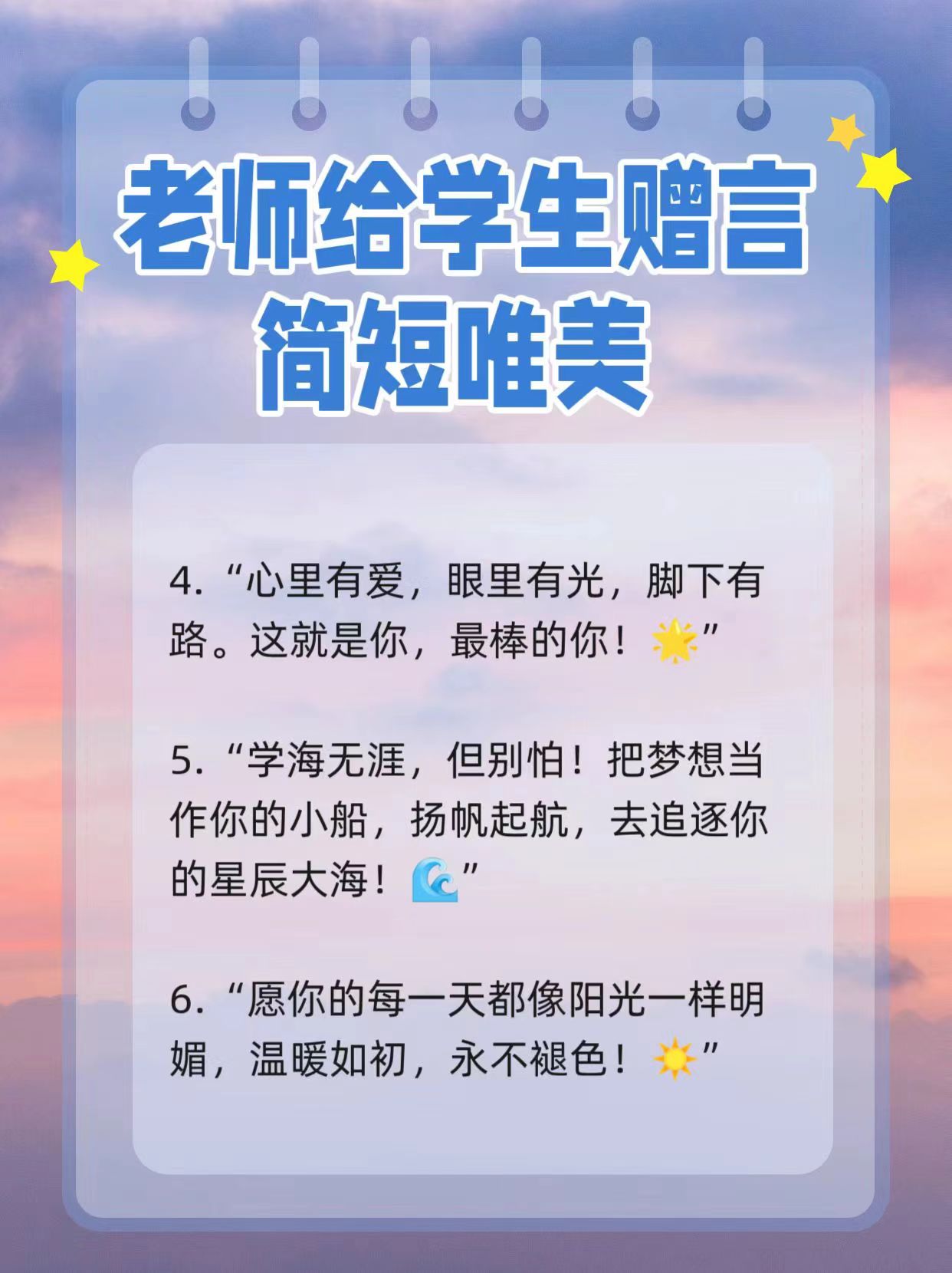 15、三尺讲台,三寸舌,三寸笔,三千桃李十年树木,十载风,十载雨,十万栋梁感谢您无私的奉献5 永恒的师恩 甘做园丁,催三春桃李建百年大业愿为人梯,育一代英才立千秋功德您的恩情,我们永生难忘给老师留言的暖心句子 1 照亮前行的路 老师,您是海洋,我是贝壳,是您给了我斑斓的。