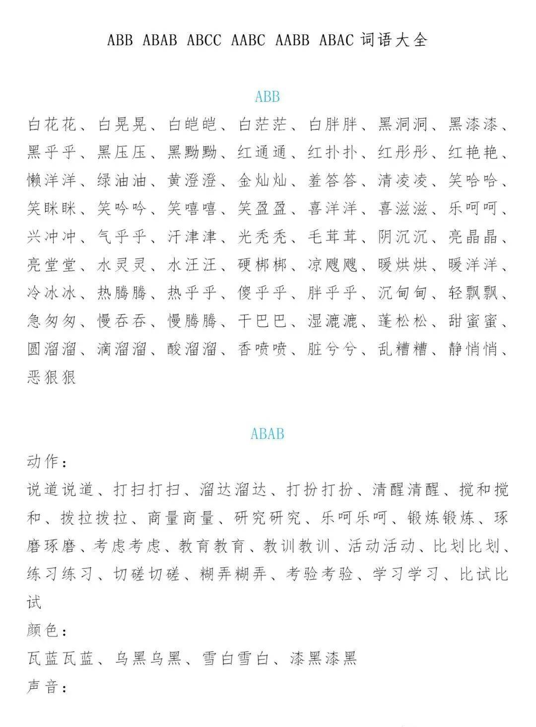 6、4 三年级近义词反义词动物数字的四字词语是abb,abab,abcc,aabc,aabb, ABB白花花白晃晃白皑皑白茫茫白胖胖黑洞洞黑漆漆黑乎乎黑压压黑黝黝红通通红扑扑红彤彤红艳艳懒洋洋绿油油黄澄澄金灿灿羞答答清凌凌笑哈哈笑眯眯笑吟吟笑嘻嘻笑盈盈喜洋洋喜滋滋乐呵呵兴冲冲。