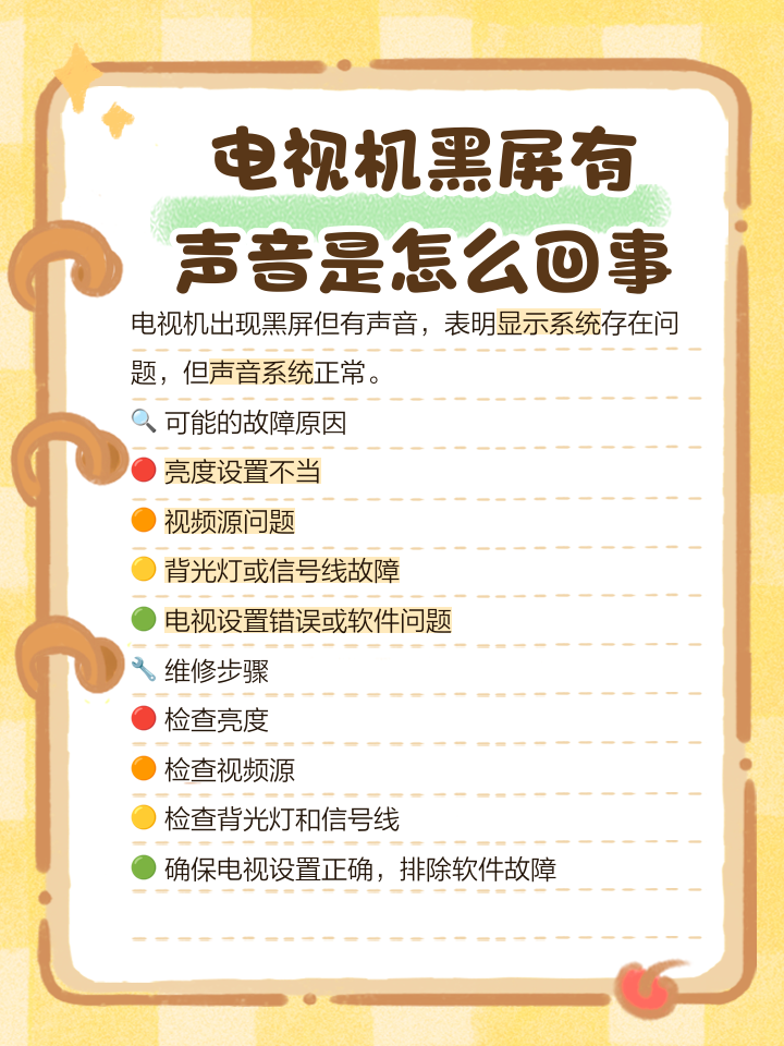 13、电视有声音无图像的常见原因是背光故障或信号传输问题1 背光模组异常多数液晶电视需背光源才能显示画面若声音正常但屏幕全黑,可能是背光灯管损坏或驱动电路故障,常见于使用5年以上的LED电视应急方法用手电筒斜照屏幕,若隐约可见画面轮廓即可确认2 电源板供电不稳当电源板中负责屏幕供电的模块。