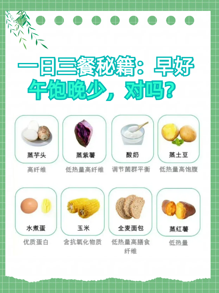 一日三餐,在以下这几个时间点吃最好哦早餐6点半到8点半这可是元气满满的一天的开始呢,一定要吃得丰盛点,多补充蛋白质和碳水化合物,当然啦,脂肪也要适量摄入一点点哦午餐11点到13点半经过一上午的忙碌,早餐的能量都差不多用完啦,午餐可得好好补充补充,这样才能保持下午的工作。