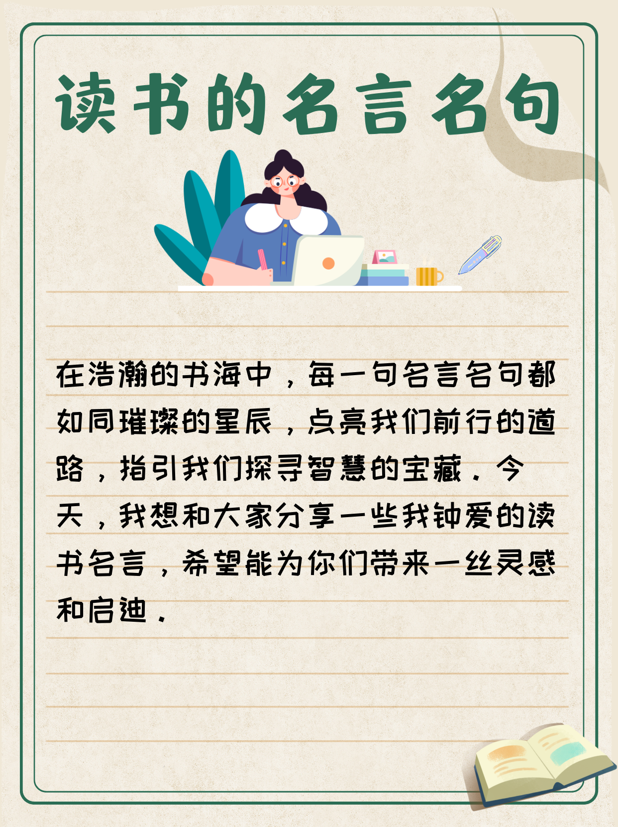 15、#励志名言# 导语一个爱书的人,他必定不致缺少一个忠实的朋友一个良好的导师一个可爱的伴侣一个优婉的安慰者 整理“关于读书的名人名言读书之乐乐陶陶,起并明月霜天高”,以供大家参考,希望可以帮助到大家,感谢大家的阅读与支持! 篇一关于读书的名人名言 01读书之法,在循序而渐进,熟读而精思。