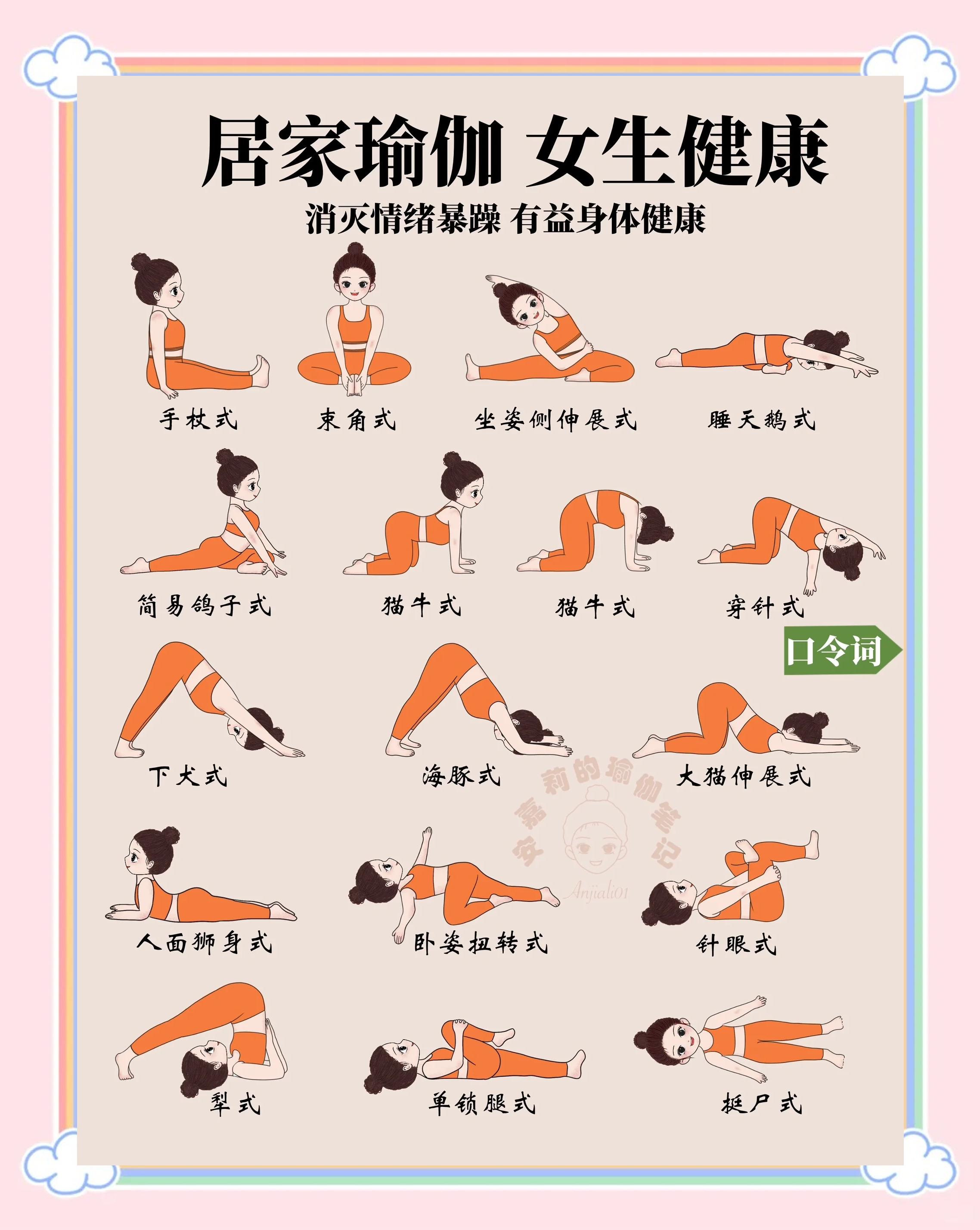 5、动作要点双手可以支撑背部,还原时屈双膝慢慢回正保持8个缓慢呼吸犁式有助于增强脊柱的柔韧性,同时促进内脏器官的血液循环,但初学者在练习时需注意保护颈部和脊柱仰卧放松 动作要点身体保持在同一直线上,两脚微微打开,全身方式下沉这个体式是瑜伽练习中的重要放松环节,有助于缓解身体的紧张;瑜伽的基本功主要包括以下几个方面,这些都是练习瑜伽时必须掌握的基础动作和技巧呼吸控制Pranayama腹式呼吸Diaphragmatic Breathing通过深长的呼吸,让腹部自然起伏,帮助放松身心 乌加依呼吸Ujjayi Breath通过轻微收缩喉咙,发出海浪般的声音,有助于集中注意力体式Asanas山式;瑜伽常见的基本动作山式站立前屈式下犬式燕式战士一式战士二式三角式倒立式 1 山式Tadasana 这是一个简单的立式,有助于练习正确的站姿和呼吸 2 站立前屈式Uttanas Pithanasana 这个姿势有助于舒展腿部和臀部肌肉,提高平衡感 3 下犬式Adho Mukha Svanasana 这个姿势可以强化;练瑜伽的注意事项1最好在家里或者比较能让人放松的场地进行 为防止手受伤,在地上铺上瑜伽垫,如果没有瑜伽垫,可以把两条大浴巾叠铺于地上尽量撤走附近的物件,切勿在空间较小环境较拥挤的场地进行2瑜伽必须在做完热身运动后方可进行 呼吸姿势或简单的准备运动会令瑜伽动作做得更到位效果;初学者适合练习的瑜伽动作主要分为以下几类一站姿类动作山式Tadasana是站姿的基础体式,可单独练习30秒至1分钟该动作通过调整双脚与骨盆的位置,使身体重心均匀分布,帮助纠正长期不良站姿导致的臀部下垂腹部凸出脊椎紧张等问题练习时需保持脚跟脚掌均匀受力,膝盖与脚踝对齐,脊柱向上延展。