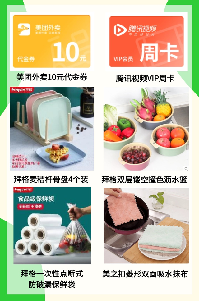 美团外卖代金券、腾讯视频会员卡、以及超多家居神器