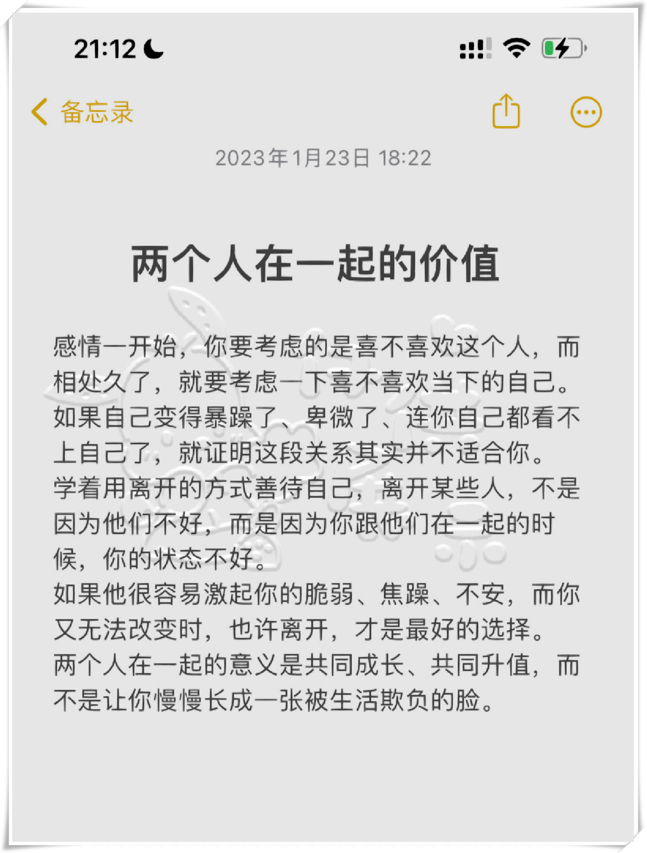 有些话无法对父母说出口,对朋友说又差一点意思,但和对方说就像是给无处安放的灵魂找到了一个可以依靠的港湾 一直觉得,感情最好的状态不是不吵架,而是吵完架能放下所谓的面子与耐心去和对方沟通,世界上根本没有完完全全合适的两个人,都是需要彼此磨合珍惜 最后,两个人在一起的真正意义是彼此的鼓励和支持,相互滋养和成长并给予能;9 两个人在一起,最重要的是感到快乐和舒适如果感到痛苦和不适,那说明不爱10 没有感情基础,很难真正理解和包容对方矛盾和问题在所难免,关键是如何处理11 条件合适的伴侣可能会面临更多琐碎问题,处理不当会导致更深矛盾12 相爱的人会在矛盾中成长,共同努力解决问题,彼此包容13。