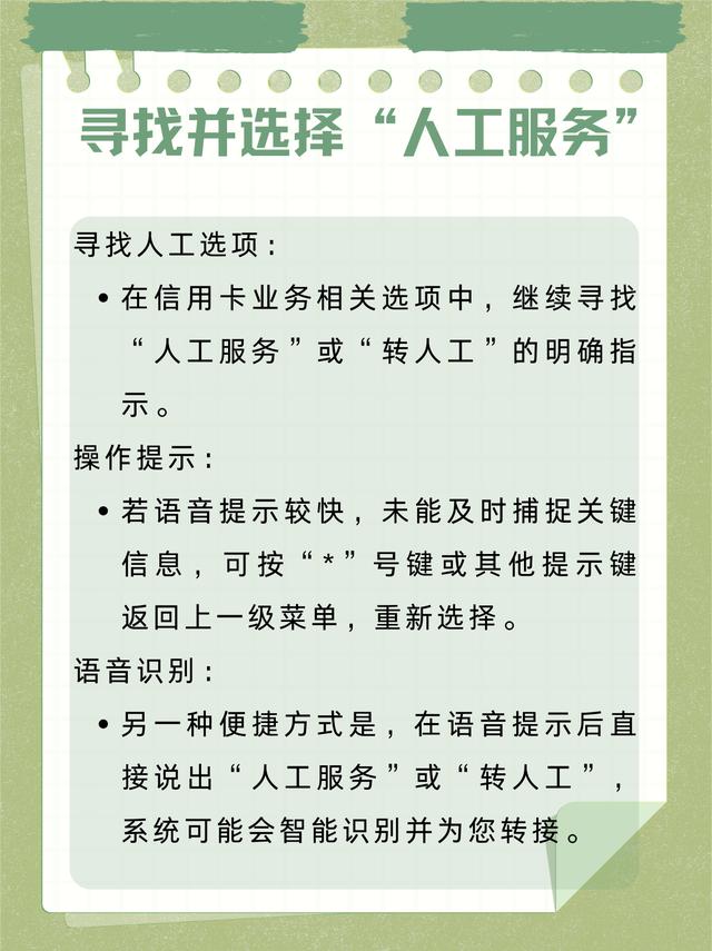 2、后,根据语音提示,直接按“9键”,即可转接到人工客服这是最直接且常用的转人工方式二通过按键选择服务项目后转人工 如果您需要先了解或办理特定业务,再按以下按键选择对应的服务项目后,通常也会提供转人工的选项按“1键”进入个人客户服务。