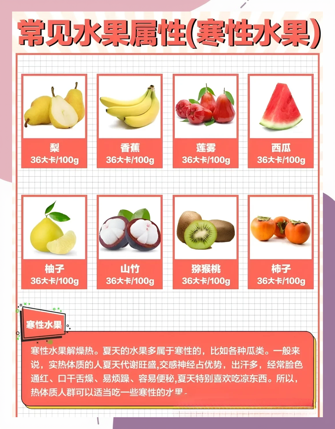 凉性水果与热性水果的分类 凉性水果主要包括梨火龙果西瓜柿子香蕉猕猴桃等这些水果通常具有清热解暑生津止渴的功效尤其在炎热的夏季,凉性水果受到广大消费者的喜爱它们有助于缓解体内的热气,调整身体状态此外,这类水果一般含有丰富的维生素与矿物质,有益于健康凉性水果的特性;一不同属性的水果1热性水果菠萝温州蜜柑红桔南丰蜜桔桃李杏石榴杨梅山楂枣杨桃槟榔等2中性水果草莓猕猴桃葡萄美国提子枇杷荔枝龙眼等3凉性水果甜橙脐橙血橙梨苹果西瓜香蕉等二如何选择水果在选择水果的时候,最好根据自己。