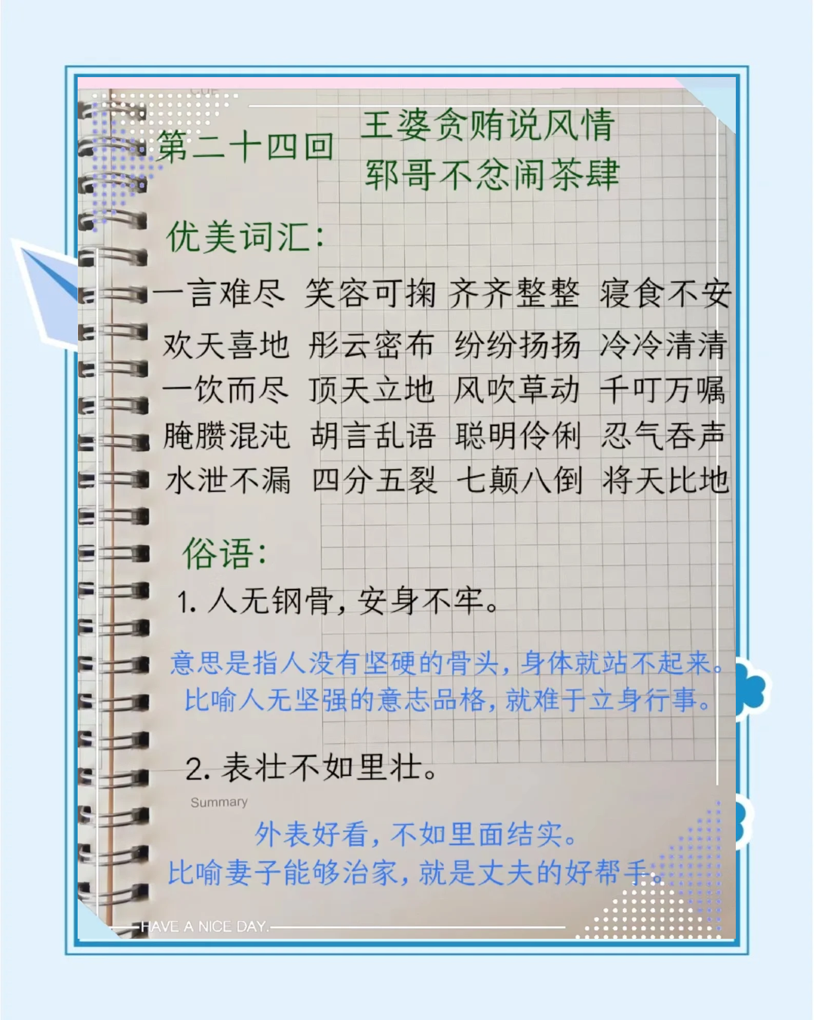 4、下面是以水浒传好句好段摘抄为主题的短文一“天生我才必有用”李逵他是一个心怀大志的人,这是水浒传中李逵的名言不断提升自己为社会做出更多的贡献在我们日常生活中也应该有李逵的精神二“千里共婵娟但愿人长久”这是辛弃疾在青玉案·元夕中的诗句表达了对美好。