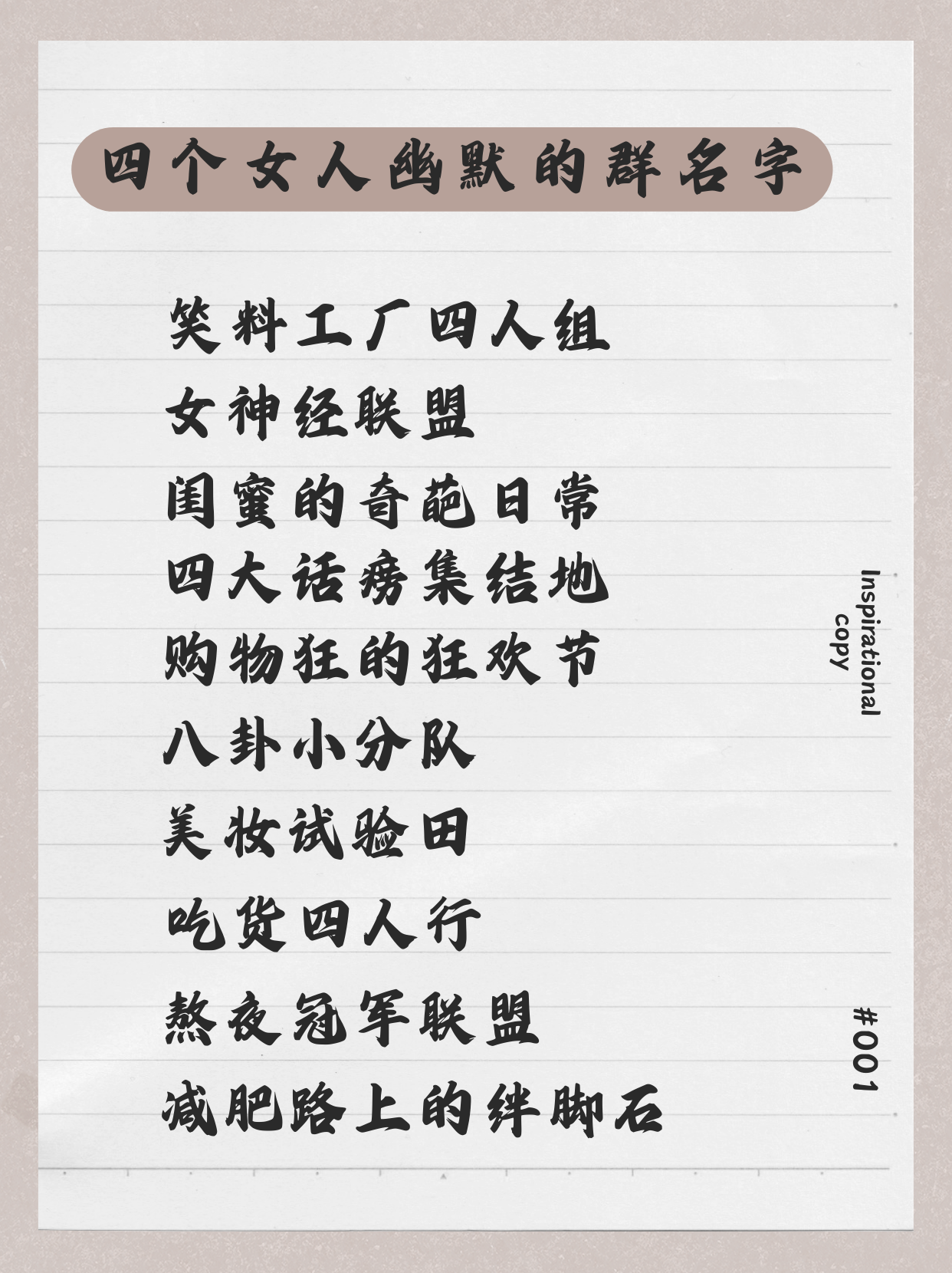 4青龙帮 5破喉咙 6不能出去 7这里是冷宫 8别闹我有药!9花样作死小分队 10山东蓝翔技校 1114届挖掘机系 12火星密探联络办公室 13青春无敌美少女 14国粹研究管理部 15花样作死大赛组委会 16摸不到胸的闺蜜群 17正经人的不正经群 18搞笑微信群名字大全19蓝天。