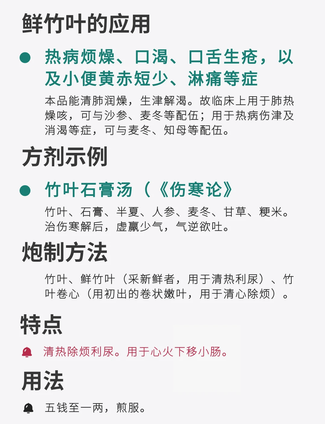 1、1清热除烦竹叶水性质偏寒,能清心火与胃火,对热病引起的烦渴口舌生疮心烦失眠等症状有缓解作用其寒性可中和体内热邪,改善因内热导致的情绪烦躁与身体不适2利尿通淋竹叶水具有清热利尿的功效,可促进尿液排出,缓解小便短赤尿痛尿频等泌尿系统症状其作用机制与竹叶中含有的生物碱和有机酸有关,能调节体内水液代谢3。