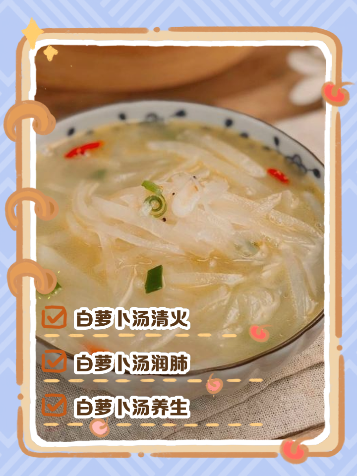 白萝卜汤要做得好喝,关键在于选用新鲜的白萝卜,搭配适宜的食材和调味料,同时注意炖煮的火候与时间首先,选择白萝卜时要挑选表皮光滑肉质紧实无裂痕的新鲜萝卜新鲜的白萝卜含有充足的水分和营养,炖煮时更易释放出自然的甜味,使汤品更加鲜美将白萝卜洗净后,根据个人喜好切成块状或片状。