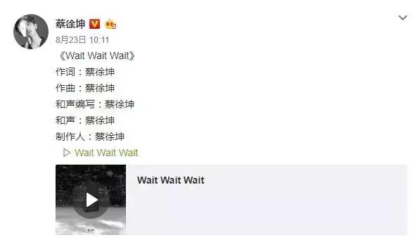 就在粉丝们还没欣赏够这张全新EP之时,昨天上午十点,蔡徐坤的全新原创单曲《Wait Wait Wait》又重磅上线了。这首单曲,蔡徐坤一人包揽了词、曲、和声编写、和声和制作人,在流量正盛的时候,能沉淀下来写了几首原创作品,足以看得出他对音乐的热爱与态度~