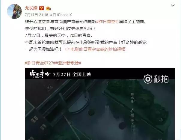 团队里的vocal担当尤长靖先是喜提电视剧扶摇的ost,然后又给电影《昨日青空》演唱了主题曲~