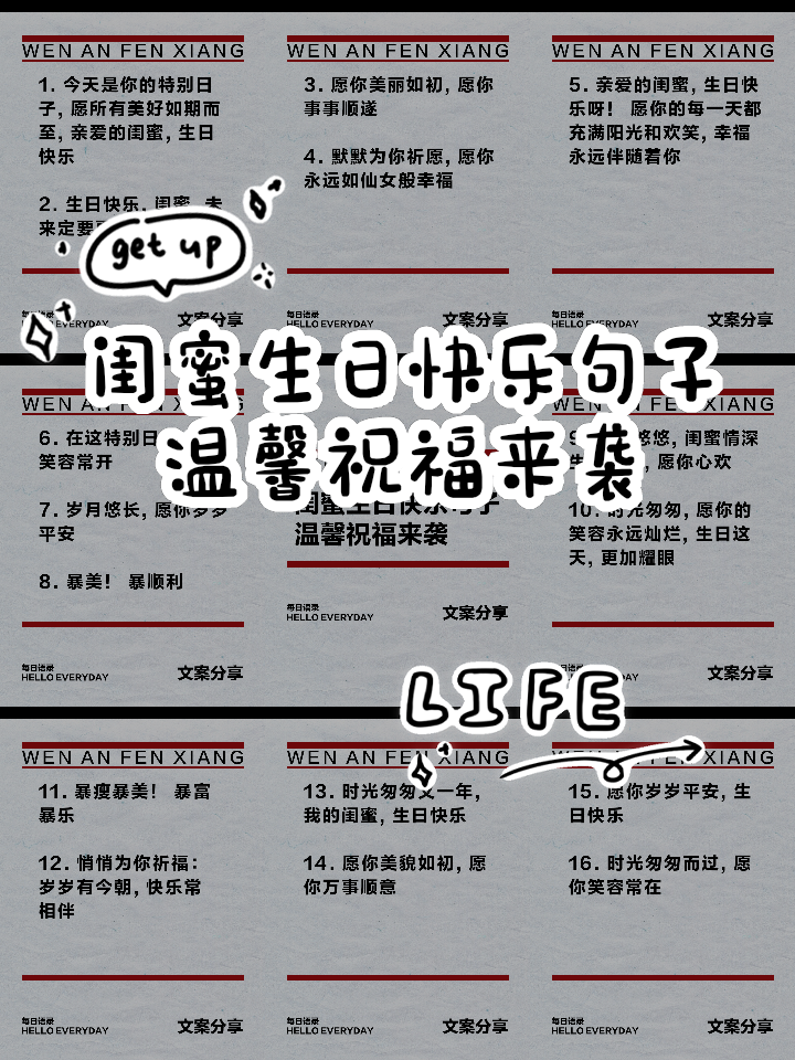 以下是一些闺蜜简短生日祝福语1洪亮的钟声荡气回荡,璀璨的烟花美丽绽放,潺潺的溪水叮咚回生日的歌曲为你歌唱祝你生日快乐,人生路上平安吉祥,好运永远伴你身旁!2打开心灵的天窗,投进幸福的阳光,驱散阴郁的蛮荒,释放幸福的希望亲爱的朋友,你的生日,愿你每天身健体康,生活快乐哦!3只有懂得生活的人,才能领。