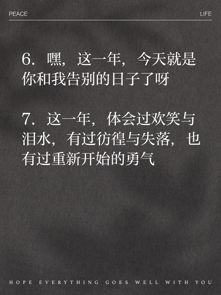 通俗文案类1古人都扫尘过年,愿你也扫去心中一年的风尘,在新春佳节的时候,祝你一年都开心2新的一年,新的开始新的祝福,新的起点3新年的第一天,我在默默地为你祝福,愿你的生活中夏宜人,冬温暖,秋收获,春满园4跨年再也找不到当初的感觉,毕竟物是人非了5过年了给;今天是2021年的最后一天,希望一切重新开始,收拾好心情,重新出发,愿你2022年的一切美好如期而至2022最后一天了,时时刻刻提醒自己,专注当下就好今天是2022年的最后一天,让我们向这一年一直不服输不退缩的自己说一声谢谢面对未来的生活,愿我们能坚持运动早睡早起,有所期待奋力向上请相信;2022年最后一天太阳发朋友圈如下1窗外没有太阳不要紧,只要心里有光,怎样都会温暖,年的最后一天,愿我们都能温暖如初幸福依旧再见,你好2今晚最后一轮夕阳,记录着曾经美好的过往明早第一缕曙光,寄托着重新开启的希望朋友第一个愿望,承载着幸福安康的吉祥跨年祝福提前送上3太阳。