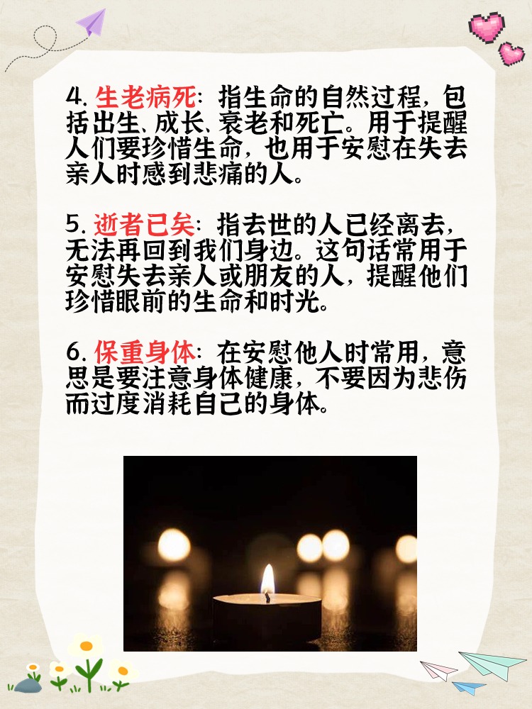 1逝者已登仙界,生者应节哀顺变2将她放在心中,她便不曾远离,请节哀3请节哀顺便,不要太悲伤,照顾好自己4请节哀,人总有那一天,不要太难过了5为了爱你和你爱的人,一定要坚强地走下去6家人在那边会过得很好希望大家不要太难过7生老病死是自然规律,去世是她。