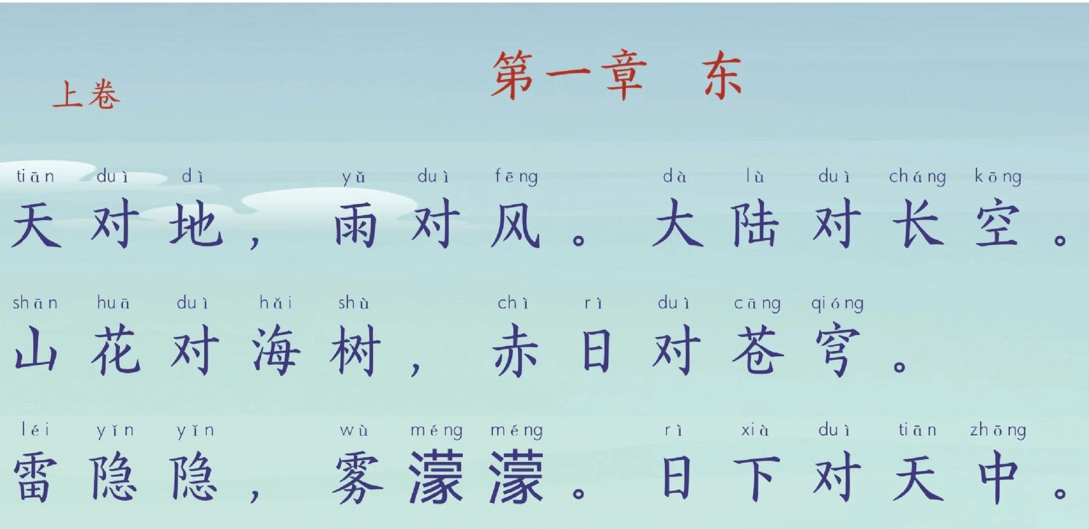 6、天对地,雨对风大陆对长空山花对海树,赤日对苍穹雷隐隐,雾蒙蒙日下对天中风高秋月白,雨霁晚霞红牛女二星河左右,参商两曜斗西东十月塞边,飒飒寒霜惊戍旅三冬江上,漫漫朔雪冷鱼翁河对汉,绿对红雨伯对雷公烟楼对雪洞,月殿对天宫云叆叇,日曈朦腊屐对渔蓬过天星似箭,吐魂月如弓驿旅客逢梅子。