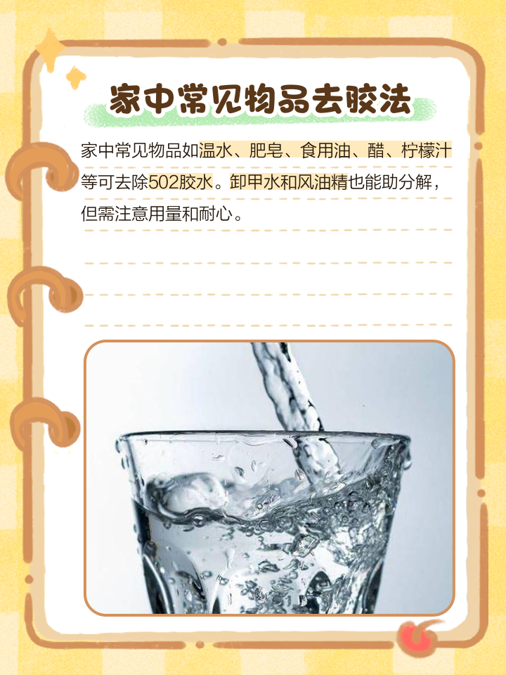 如果手上的粘合剂较少,可以使用热源如热水吹风机或热毛巾等来加热粘合剂加热可以帮助分解胶水,使其更容易清除但要注意不要过度加热,以免烫伤皮肤 3使用油脂 有些油脂可以有效地去除502胶水例如,橄榄油椰子油或食用油等都可以用来涂抹在粘合剂上,等待几分钟后再轻轻擦拭,就可以去除胶水 4使用指。