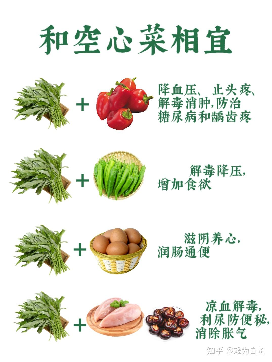 2空心菜+彩椒空心菜和彩椒搭配食用,富含维生素和矿物质,可以起到降血压止头疼等的功效,另外还可防治糖尿病和龋齿疼3空心菜+尖椒空心菜和尖椒搭配在一起食用,不仅味道甘爽甜美,还含有丰富的营养物质,有降血压解毒消肿的功效4空心菜+鸡蛋空心菜和鸡蛋搭配在一起食用,可以用来炒。