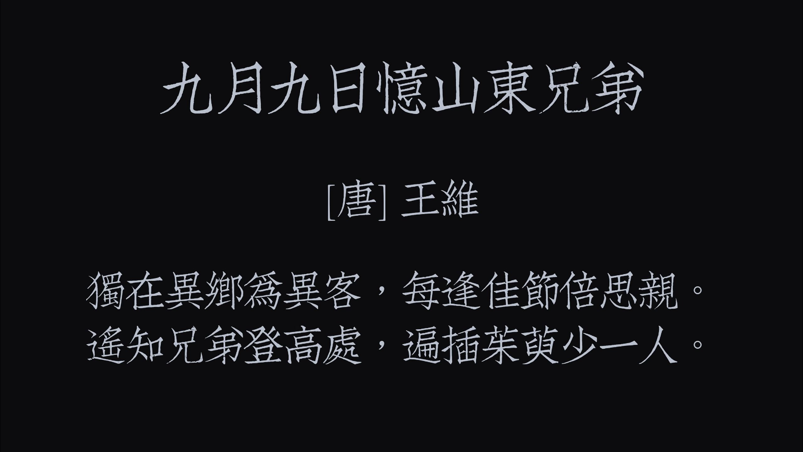 16、独自远离家乡无法与家人团聚,每到重阳佳节倍加思念远方的亲人远远想到兄弟们身佩茱萸登上高处,也会因为少我一人而生遗憾之情九月九日忆山东兄弟 唐代王维 独在异乡为异客,每逢佳节倍思亲遥知兄弟登高处,遍插茱萸少一人注释 九月九日即重阳节古以九为阳数,故曰重阳忆想念山东。