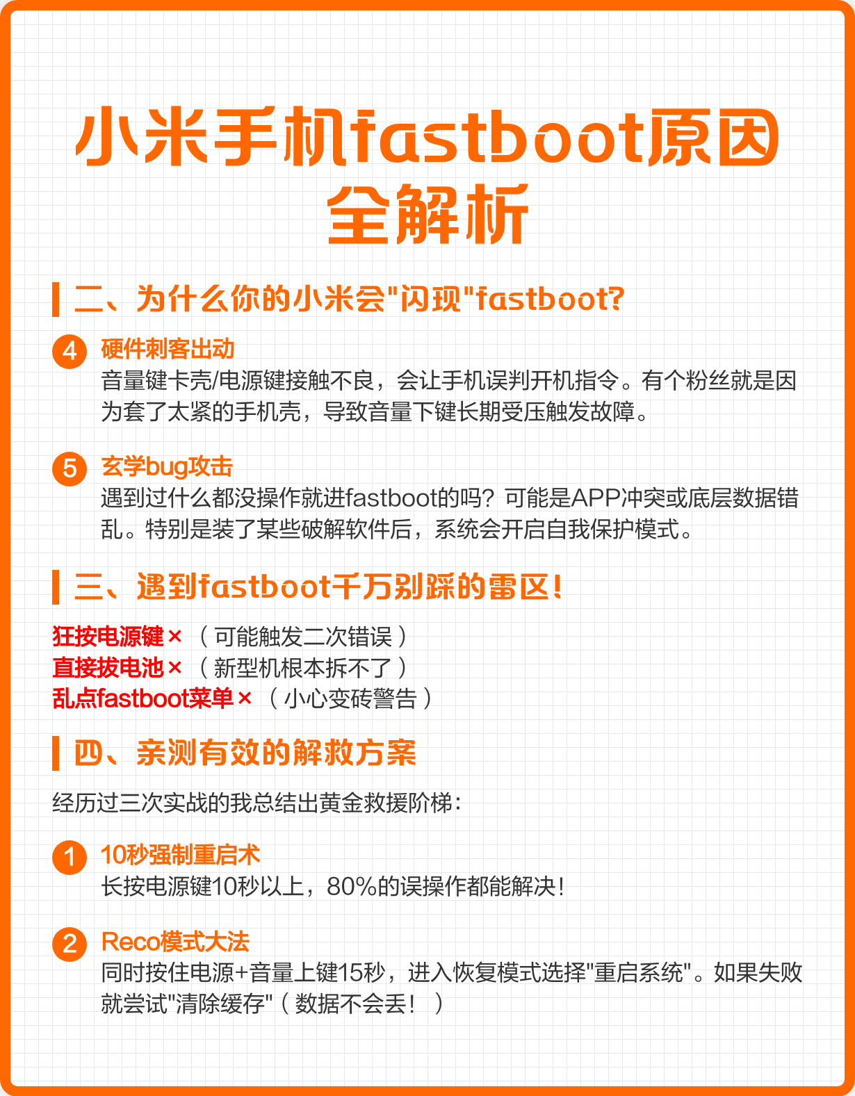 9、1系统问题 如果我们的小米手机系统文件被篡改,比如手机获取了最高管理员权限删除了一些系统文件,那么手机就会重启进入fastboot模式,解决的办法我们可以尝试重新刷机来解决,自己不会的可以去小米售后进行刷机,自己会的可以使用小米手机助手来进行系统恢复操作2音量键损坏 部分小米手机如果使用时间长了。