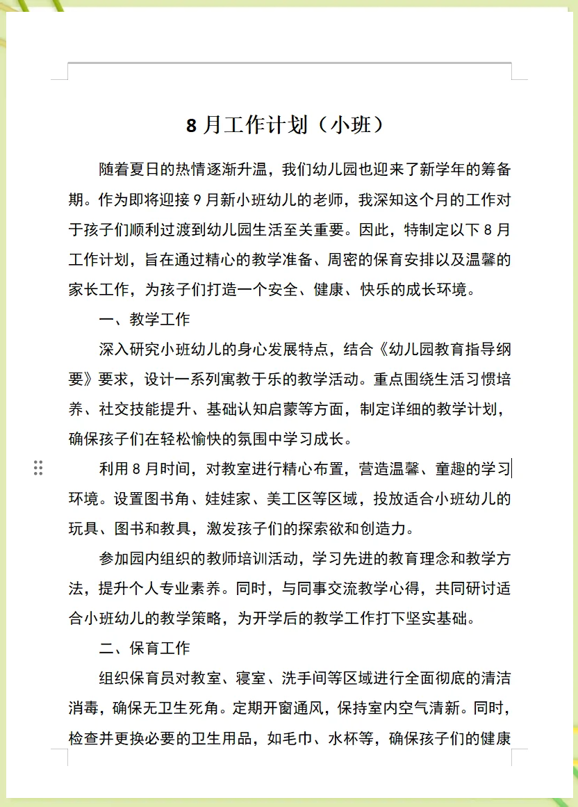1、小小班的小朋友由于刚开始进入集体生活,教师要尽快地使小班适应集体生活和培养他们各方面的良好习惯,让每一个小班在小班园中都能健康快乐的成长那么怎么写一份计划呢?下面和我一起来看看吧! 小小班家长工作计划1 一现状分析 一成绩 1部分小班家长的教育观念较好,能够尊重小班的意愿,与小班关系平等;小班的家长工作计划1 家庭是幼儿的第一学校,家长是幼儿的第一位老师幼儿园保教工作要取得良好的效果,运用专业知识指导家庭教养是非常重要的只有使家庭教养与园内教养协调起来,明确共同的目标,统一教养的方法,才能更大限度的提高保教的质量因此家长工作在我们的工作中有着举足轻重的作用为了更好的开展家长工作;幼儿园开学第一周家长工作计划主要包括以下几点参与开学典礼时间安排家长应提前了解并参与9月3日上午915的开学典礼活动,与孩子共同见证这一重要时刻活动准备鼓励孩子穿着统一的园服参加,营造集体归属感同时,家长可以准备一些拍照设备,记录下孩子开学典礼的精彩瞬间了解班级情况教师介绍;幼儿园小班家长工作计划1 一指导思想 纲要指出“家庭是幼儿园重要的合作伙伴应本着尊重平等合作的原则,争取家长的理解支持和主动参与,并积极支持帮助家长提高教育能力”通过上学期的培养和努力,幼儿在家长和老师的共同教育指导下,在各方面都有了很大的进步,如在行为习惯上自理能力上学习思维上都有了明显。