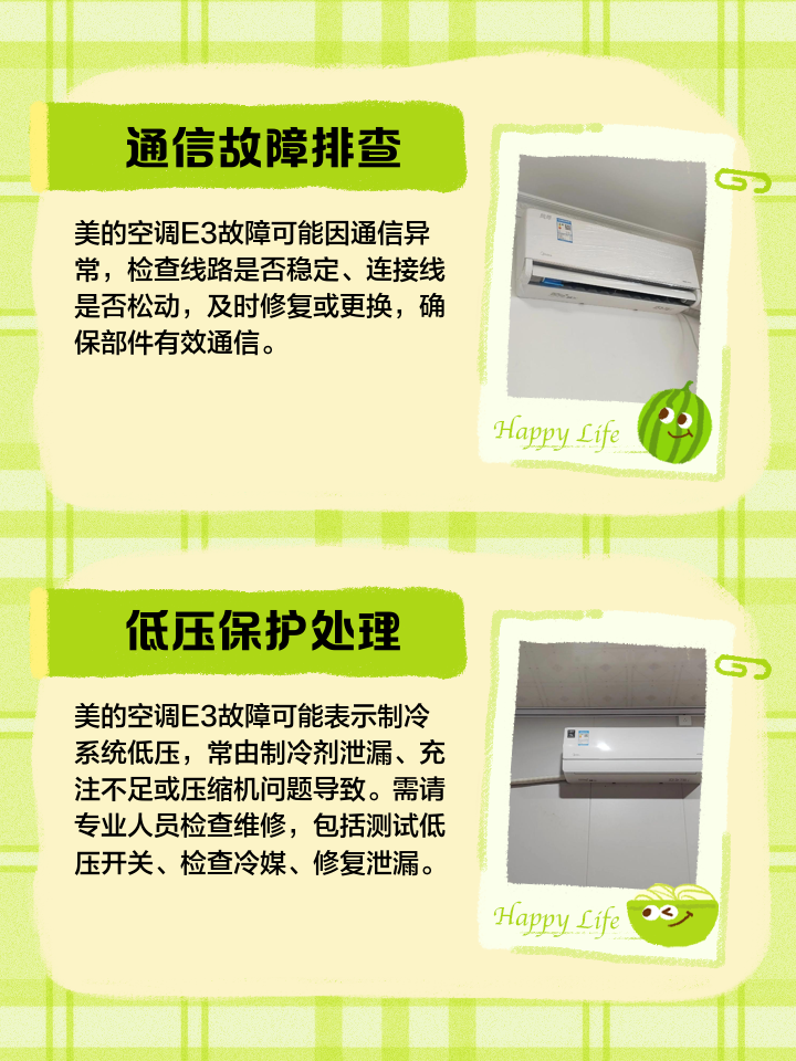 例如,对于美的空调,E3故障可能表示空气循环系统出现问题,包括风机电路故障温度传感器故障管路堵塞或电源电压不稳定而在其他情况下,E3故障可能表示高压压力异常压缩机电流过载保护压缩机电动机冷却介质通路受阻或使用环境温度过高如何解决E3故障 1 重启空调有时候,简单的重启可以消除一些临时。