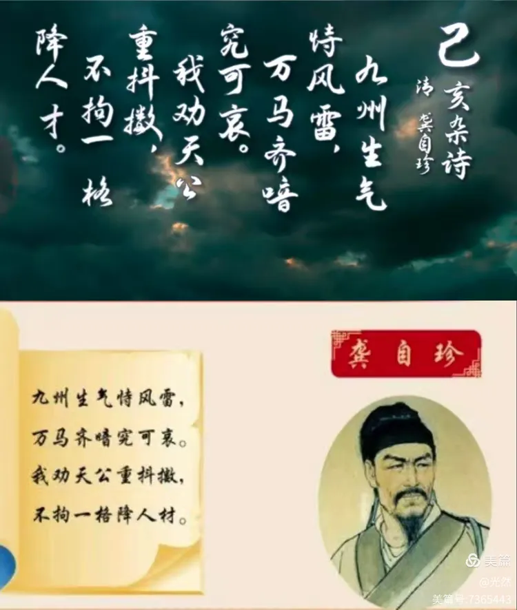 “我劝天公重抖擞,不拘一格降人才”的意思是我奉劝皇上能重新振作精神,不要拘守一定规格选取更多的人才“我劝天公重抖擞”这里的“天公”指的是上天或皇帝,“重抖擞”意味着重新振作起来,展现出活力和决心诗人希望皇帝能够摆脱沉闷和消极的状态,焕发出新的精神面貌“不拘一格降人才”。