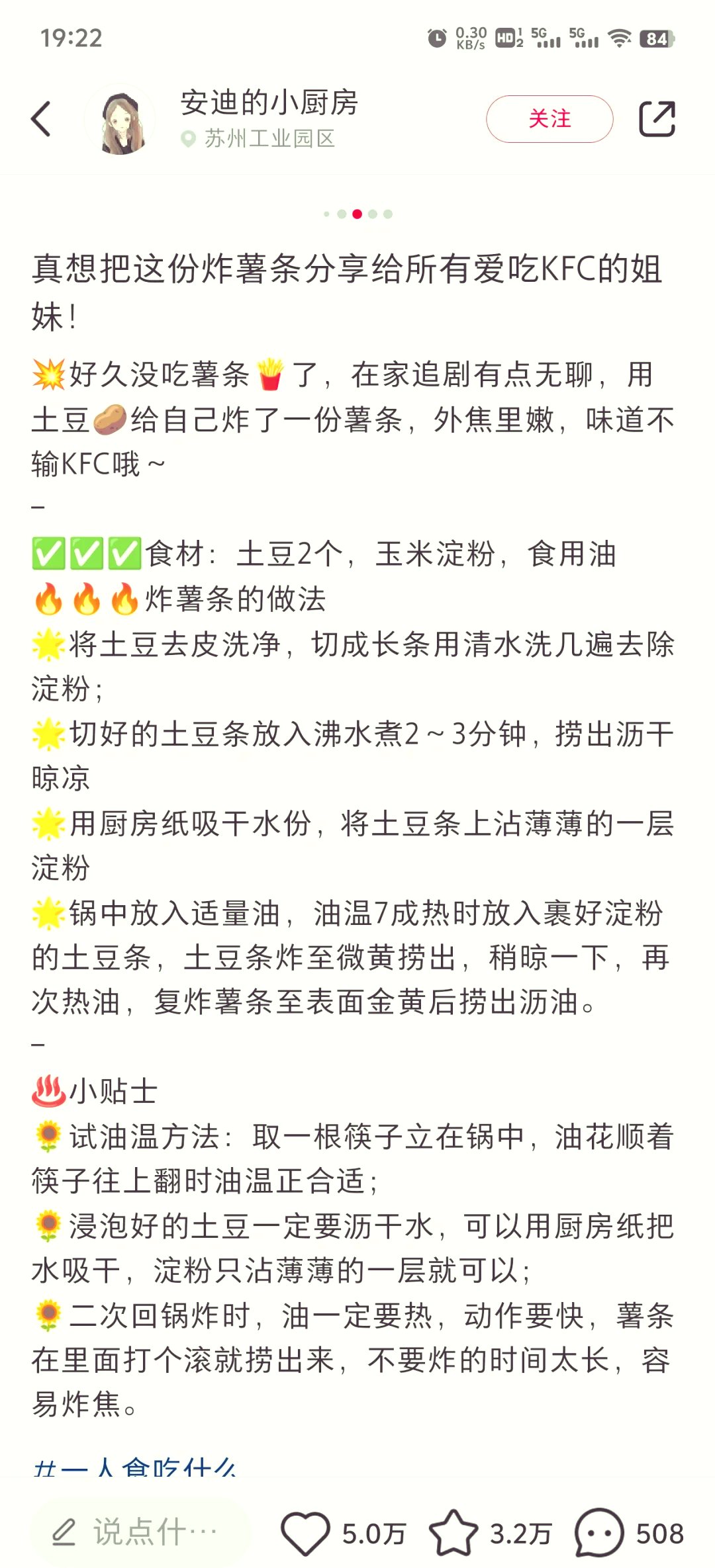 3、1 准备炸篮和薯条 找一个炸篮,将生的薯条倒入其中2 控制油温 炸薯条的油温要控制在170度左右3 炸制过程 将装有薯条的炸篮放入热油中,开始炸制 由于薯条是冷冻的,需要在炸到1分30秒左右时,将炸篮提起,脱离油面,晃动5下左右,使薯条松散,避免粘连 然后再次将炸篮放入;炸薯条将土豆切成条状,热油煎炸即可主料土豆1个辅料番茄沙司10克盐1克植物油适量做法1土豆洗净去皮,切成细条2把切好的土豆条放进锅里煮熟3将土豆条捞出晾干4装进保鲜盒或者保鲜袋,放进冰箱冷冻,冻到土豆条硬邦邦的5锅里放油,烧至8成热放进土豆条;制作炸薯条其实是一项简单而有趣的厨艺挑战掌握了正确的步骤和技巧,在家自制的炸薯条不仅方便快捷,而且食材新鲜干净卫生,丝毫不逊色于快餐店的经典薯条重要的是,我们可以控制用油量,确保健康饮食所需材料黄心土豆选择新鲜饱满的土豆,这是炸制美味薯条的关键食用油以清澈透明的植物。